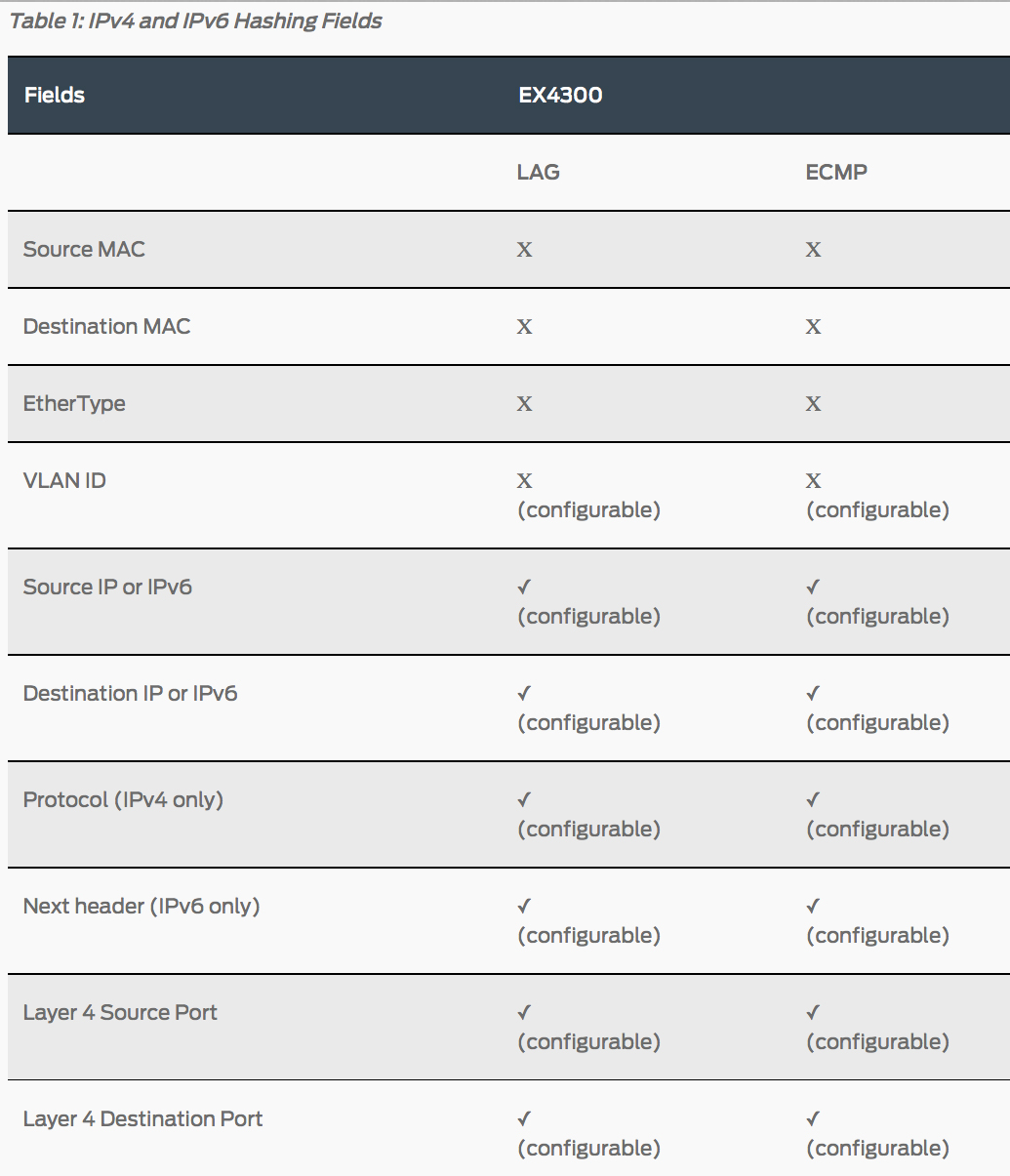 In the above URL you can look more closely at the first table (Table 1). You will see that the table actually shows what IPv4 and IPv6 payload fields are being used by their hashing algorithm by default. EVERYTHING with a “✓” is a field that is on by default.