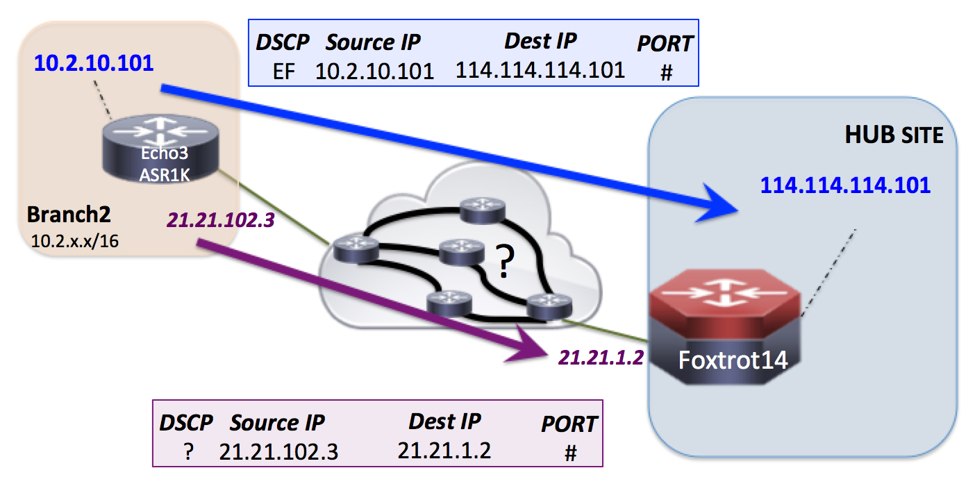 Let’s say you check the health of the path between Branch2 and the Hub Site with some type of probe/IP SLA. You will be doing it from the 2 WAN IP addresses 21.21.102.3 and 21.21.1.2. Right? How do you know that “health check” of the path between Branch2 and the Hub Site will actually end up going over the same path as the critical traffic between those two hosts?
